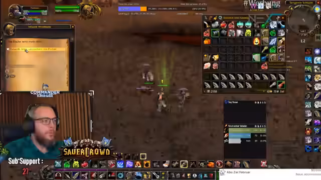 02:57:06Der Stream leitet in eine neue, taktischere Mission über, bei der vier Wachpostentürme in Brand gesetzt werden müssen. Diese Aufgabe erfordert präzise Navigation und die Bewältigung von Gefahren wie einer rutschigen Brücke. Während die Mission ausgeführt wird, tauchen Server-Lags auf, die das Gameplay zusätzlich erschweren. Die Beute (Loot), insbesondere Items wie die Fackel der Vergeltung und verzauberte Stäbe, wird gesammelt und bewertet. Nach Abschluss der Quest wird der Fokus auf das Verkaufen und Handeln von Gegenständen gelegt, um Platz im Inventar zu schaffen und profitieren zu können.