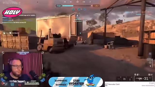 03:28:44Ein Gegner auf dem Dach wird als besonders aggressiv beschrieben, möglicherweise getriggert durch die Spielweise des Streamers. Es wird vermutet, dass alle Gegner in diesem Bereich verärgert sind. Der Streamer positioniert sich zwischen den Punkten Delta und Foxtrot und markiert weiterhin fleißig Gegner. Die Situation spitzt sich zu, als ein Tank gesichtet wird, was die Kampfbedingungen erheblich erschwert. Es wird die Befürchtung geäußert, dass die Gruppe eine heftige Auseinandersetzung bevorsteht, da gleich zwei Tanks in der Nähe sind, was eine große Herausforderung darstellt und strategisches Vorgehen erfordert.