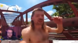 03:04:47Nach dem Restaurantbesuch wechselte der Schauplatz in einen Wald. Dort wurde eine rote Brücke als Ort für verschiedene Sprungszenarien genutzt. Nach einem weniger aufregenden ersten Sprung folgte ein Ropeswing-Versuch, der jedoch misslang, da das Seil riss. Trotzdem gelang es, einen improvisierten Hammergriff zu befestigen und erfolgreich zu springen, was die Stimmung wieder anheizte.