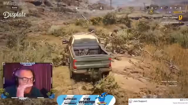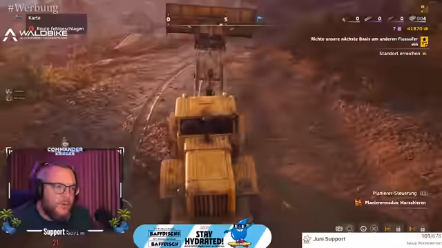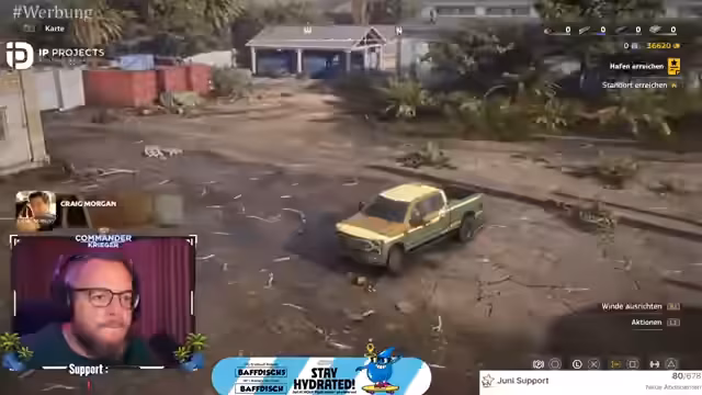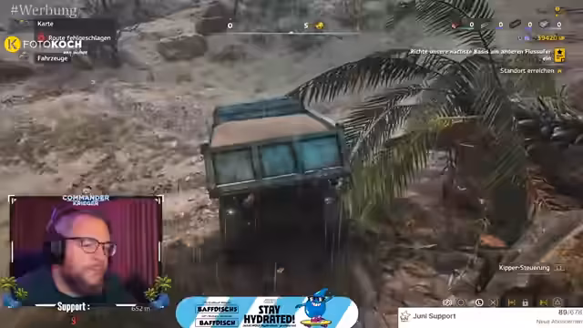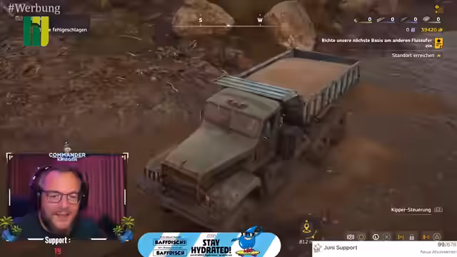 02:20:37Der Stream wird von wiederkehrenden technischen Problemen und Fahrzeugausfällen dominiert. Ein Fahrzeug steckt im Schlamm fest und kann sich nicht mehr bewegen, was einen Reset oder den Einsatz eines anderen Fahrzeuges erforderlich macht. Ein anderes Fahrzeug kippt unglücklich um, der Motor fällt aus, und eine Bauplatte für die Brücke fällt ins Wasser. Diese unvorhergesehenen Ereignisse führen zu ständigen Unterbrechungen und erfordern ständige Anpassungen des Plans. Der Streamer muss immer wieder die Kontrolle über die Situation zurückgewinnen, was zu humorvollen Vergleichen mit anderen Spielen wie 'Keep Talking, Nobody Explodes' führt.