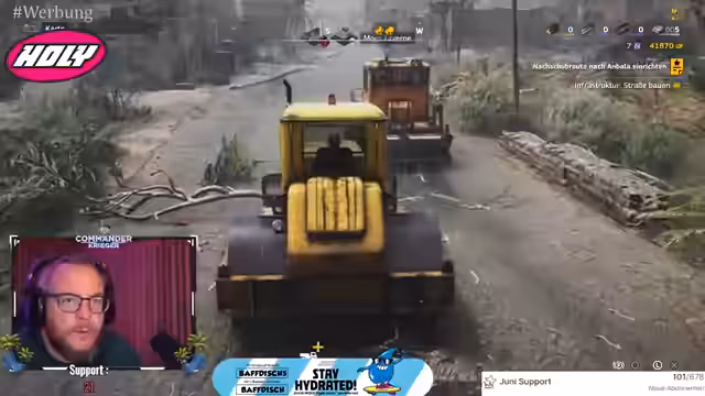03:27:21Während des Baus der neuen Straße beschreibt der Streamer das Terrain als 'Mogadischo' und 'voller Leichen', was die apokalyptische Stimmung des Spiels unterstreicht. Die ständigen technischen Probleme, wie ein umgefallener Bulldozer, wiederholen sich, was den Fortschritt erneut bremst. Gleichzeitig teilt der Streamer persönliche Neuigkeiten mit, als er von einem Krankenhausaufenthalt seiner Schwester berichtet, was den Stream für einen Moment emotionalisiert. Der Ton bleibt jedoch schnell wieder humorvoll und selbstironisch.