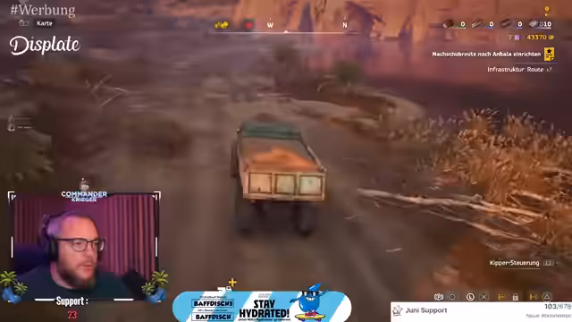 01:36:06Im Koop-Modus wird gemeinsam an einer Mission gearbeitet, bei der eine Versorgungsroute nach einem Sturm freigemacht werden muss. Der Fokus liegt auf der Beseitigung von Hindernissen wie Palmen und Steinen mit einem Bulldozer und dem Bau einer Brücke. Die Zusammenarbeit erfordert Geduld, da der Streamer neue Spielmechaniken wie den Planiermodus erst lernen muss.