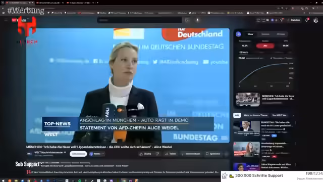06:22:43Der Streamer reagiert auf eine aktuelle Terrorattacke in Deutschland und diskutiert die politischen Auswirkungen. Er kritisiert die Politik von CDU, CSU und Grünen scharf und wirft ihnen Wählerbetrug vor, da sie es versäumt hätten, gesicherte Grenzen und konsequente Abschiebungen von Straftätern durchzusetzen. Er äußert die Ansicht, dass unter einer AfD-Regierung solche Anschläge nicht passieren würden, da die Partei sofort die Grenzen schließen und illegale Straftäter ausweisen würde. Er wertet die politische Reaktion der AfD auf den Vorfall als Werbeveranstaltung.