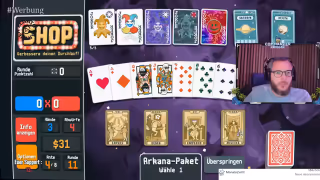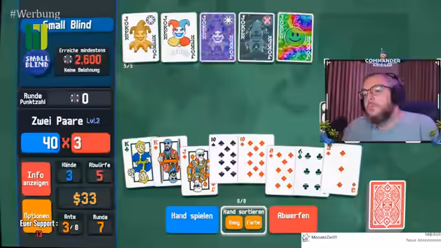 00:39:21Während des Streams wird eine Runde Poker gespielt, in der der Streamer Chips und Multiplikatoren sammelt. Er versucht, verschiedene Kombinationen wie Straßen und Paare zu bilden und äußert seine Frustration über die ihm zugeteilten Karten. Trotzdem gelingt es ihm, durch geschicktes Spielen und ein wenig Glück eine starke Hand mit einem hohen Multiplikator zu landen, was er als "lucky" beschreibt und die Runde erfolgreich abschließt.