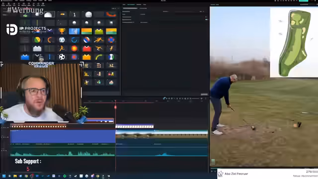 00:09:55Der Streamer widmet sich der Bearbeitung eines Golf-Videos. Er erklärt den Prozess des Trackings, bei dem er einzelnen Bildern den Ballverlauf zuweist, um eine flüssige Linie zu erstellen. Danach fügt er den stabilisierten Abschlag in das Hauptvideo ein und markiert die Position der Fahne mit einem Pfeil.