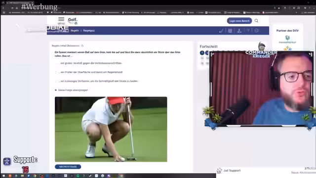 08:24:09Ein großer Teil des Streams ist der detaillierten Erklärung der offiziellen Golfregeln gewidmet. Themen wie Penalty Areas, Spielaufzeichnung, Strafschläge und das Verhalten auf dem Platz werden behandelt. Streamer und Kameramann durchleben eine fiktive Platzreife-Prüfung, die aus 15 Multiple-Choice-Fragen besteht, um das Verständnis der komplexen Regeln zu testen und für die Community verständlich aufzubereiten.