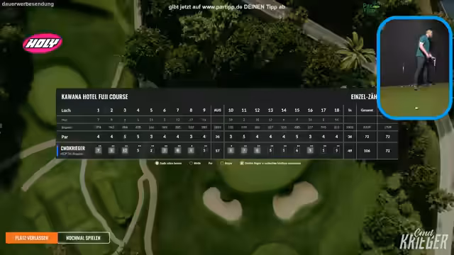 02:01:05Nach Abschluss der ersten Runde wird das Scoreboard des Tippspiels angezeigt. Dr. Schlumpf gewinnt mit 24 Punkten, sechs exakten Treffern und sechsmal einem Schlag daneben. Weitere Gewinner sind der Twerk von Marcy und Hesselschow. Der Streamer kündigt an, dass er kurz pinkeln geht und danach die nächste Runde auf dem Carvana Hotel Fuji-Kurs starten wird. Er zeigt die Scorecard des neuen Platzes und erklärt, dass er dort überall zwei Schläge mehr hat, außer auf Bahn 8 und 10, wo er nur einen Schlag mehr hat. Er ermutigt die Zuschauer, ihre Tipps für den neuen Platz abzugeben und erinnert sie daran, dass die Teilnahme kostenlos ist und sie keine Werbung erhalten. Es gibt jedoch Probleme mit der Auswertung der ersten Runde, die er an den Programmierer weiterleitet.