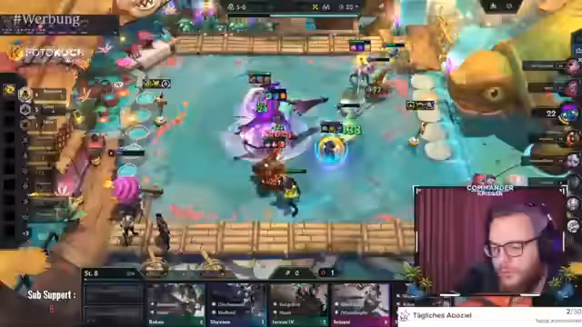00:12:42Hauptinhalt des Streams ist das Spielen des Auto-Chess-Spiels TFT. Der Streamer experimentiert mit verschiedenen Champion-Kombinationen und Items, um Synergien zu finden. Er baut hauptsächlich auf eine Assassinen-Composition mit Champions wie Talon und Akali, passt seine Strategie aber an den Spielverlauf an, um Runden zu überleben und seine Stellung im Spiel zu verbessern.