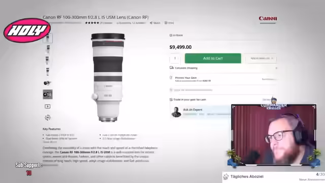 02:29:59Der Streamer führte sein umfassendes Fotografiematerial vor, das für Aufnahmen von Rennen wie der Formel 1 verwendet wird. Dazu gehörten drei Canon-Kamerabodies, darunter die neuen R1s, und ein breites Sortiment an Objektiven, darunter ein 600mm-Teleobjektiv, verschiedene Telekonverter und Spezialobjektive wie ein Tilt-Shift und ein extrem seltener 50mm-Linsen mit Blende 0.95. Die Vorstellung diente als umfassender Rundgang durch sein professionelles Equipment.