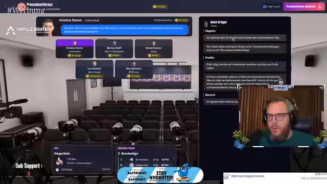 00:13:39In einer simulierten Pressekonferenz mit Bernd Kramer wird die aktuelle Form von Fortuna Düsseldorf thematisiert. Preußen Münsters abstiegsbedrohte Position auf dem 18. Platz wird analysiert. Anschließend wird der burkinische Nationalspieler Josue Tindre Beogo (22) bewertet und eine Vertragsverhandlung über drei Jahre mit Beratergebühren eingeleitet.