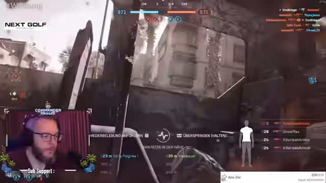 05:44:49Der Stream wechselt zu einer Session des Spiels Battlefield 6. Es werden Waffen wie das C4 und der Q-Link erwähnt. Der Streamer spielt intensiv und ist auf seine Mission fokussiert, während er mit dem Chat interagiert und für das Spiel wirbt. Die Session wird abrupt unterbrochen, da der Streamer eine persönliche Angelegenheit klären muss.