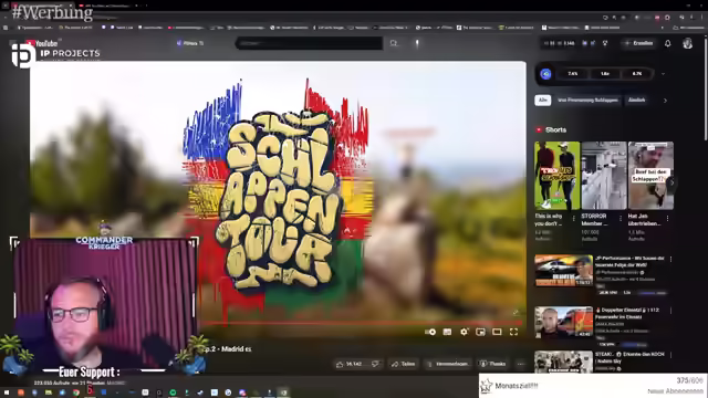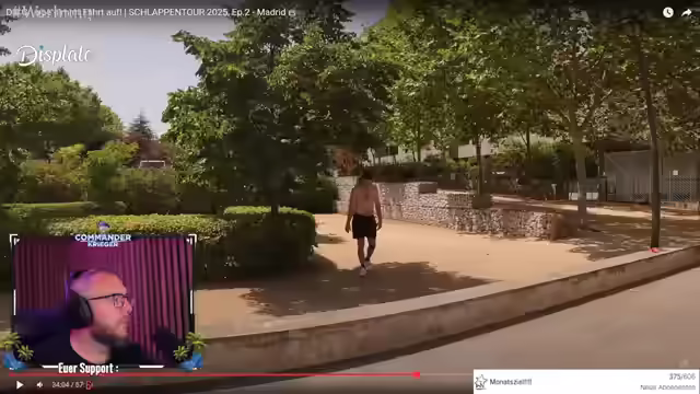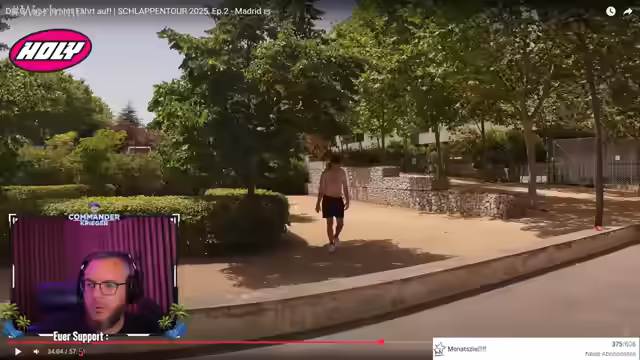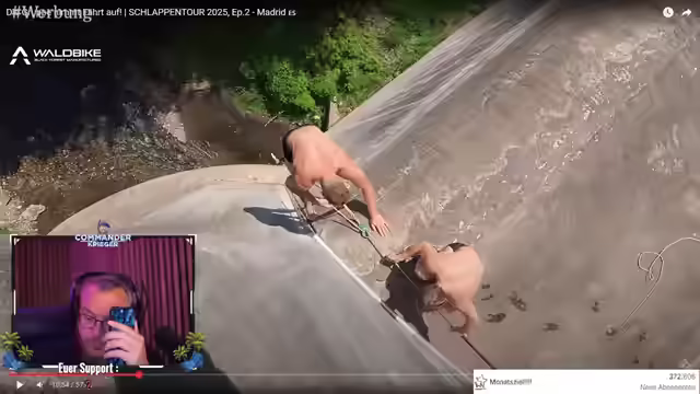01:07:09Während des Live-Streams erhält Amanda Krieger einen Anruf von einer Fahrradfirma. Es geht um mögliche Ideen für Events. Sie erkundigt sich nach dem Befinden und erwähnt, dass sie gerade die Schlappentour verfolgen. Es folgt die Information, dass die Gruppe sich nun irgendwo vor Madrid befindet und ein neuer Gast erwartet wird. Die Gruppe fährt weiter, um einen neuen Schlafplatz zu finden, da der vorherige Ort von Hunden bewacht wurde. Am nächsten Morgen wird ein Wasserfall erkundet, bevor es zum nächsten Ziel geht. Es wird ein B-Wall-Shot für Madrid gedreht. Anschließend wird festgestellt, dass das Tor zum geplanten Campingplatz verschlossen ist, aber sie finden einen Weg, es zu öffnen. In Madrid angekommen, beginnt die Schlappentour mit Klaus, der direkt wieder ins Double-Comb-Game einsteigt. Es wird erwähnt, dass es in Madrid 10 Grad wärmer ist als in Biarritz.