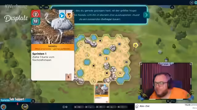 01:39:05Es wird über ein Ticket to Ride Spiel gesprochen, bei dem es darum geht, lange Strecken zu bauen, um Punkte zu sammeln. Eine längere Strecke bringt mehr Punkte. Es gab eine knappe Niederlage mit nur zwei Punkten Unterschied. Anschließend beginnt ein Tutorial für das Spiel Archinova, bei dem man einen Zoo leitet und Gehege baut, Tiere aufnimmt, Sponsoren wirbt und Artenschutzprojekte unterstützt. Jede Aktion hat eine Stärke, die von 1 bis 5 nummeriert ist, wobei eine höhere Stärke einen stärkeren Effekt hat. Nach einer Aktion rutschen die anderen Aktionen nach oben und gewinnen an Stärke. Das Tutorial führt durch die ersten Schritte, wie das Bauen eines Geheges für einen Nandu und das Ausspielen von Tierkarten. Tiere erhöhen die Attraktion des Zoos, was sich auf die Siegpunkte und das Einkommen auswirkt. Einige Tiere haben zusätzliche Voraussetzungen, wie z.B. ein Amerika-Symbol oder ein Gehege am Wasser.