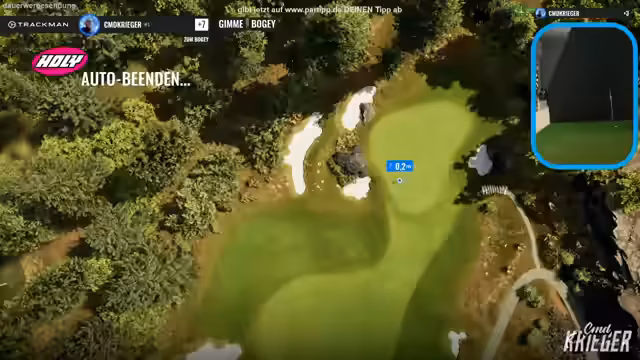 00:19:39Ein technisches Problem wird gemeldet, als die Leinwand kaputt geht, was den Stream kurz unterbricht. Der Streamer weist dies nicht auf sich selbst und versichert, dass jemand anderes dafür verantwortlich ist. Trotz dieses Problems wird das Spiel fortgesetzt. Der Streamer konzentriert sich auf den nächsten Schlag, der über eine Distanz von 36 Meter erfolgen muss und dabei bergauf geht.