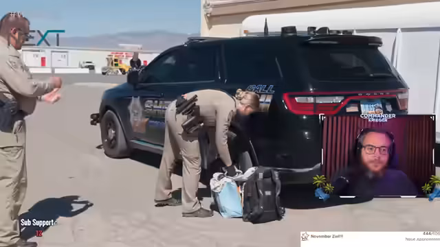 03:27:01Die Tagschicht beginnt mit Deputy David Diaz, der für das Nye County Sheriff's Office im Dienst ist. Der Streifenwagen ist ein Dodge Ram mit V8 Hemi, ein Standard-Polizeifahrzeug der Behörde, ausgestattet mit Top-Leuchten. Der Streamer und sein Begleiter befinden sich in Nye County, Nevada, etwa eine Stunde westlich von Las Vegas, mitten in der Wüste. Es wird erwähnt, dass es sehr heiß ist, aber der größere Platz im aktuellen Fahrzeug im Vergleich zu früheren Fahrten positiv hervorgehoben wird. Es wird auch darauf hingewiesen, dass die Officers in den USA oft alleine unterwegs sind, was bedeutet, dass Begleiter im Notfall zur Hilfe eilen müssen, was auch das Schießtraining am Vortag begründet.