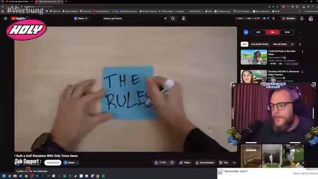 04:22:37Der Streamer schaut sich ein Golfvideo an, in dem Martin Borgmeier, ein deutscher World Long Drive Champion, auftritt, der einen Golfball über vier Fußballfelder weit schlagen kann. Das Video zeigt eine 2-gegen-2-Challenge im 'Break 50'-Format. Der Streamer ist beeindruckt von Borgmeiers Fähigkeiten und der Möglichkeit, ein Par 5 mit einem Drive und einem Putt zu bewältigen. Er plant selbst, Drohnen-Footage für seine eigenen Golfvideos aufzunehmen, wird aber durch das schlechte Wetter und anhaltenden Regen behindert. Er hat sich für ein Turnier angemeldet, befürchtet aber, dass auch dort starker Regen erwartet wird. Das Video wechselt dann zu einem Projekt, bei dem ein Golfsimulator ausschließlich mit günstigen Artikeln von der Website Teemu gebaut werden soll, wobei für jede Kategorie das günstigste Produkt gewählt werden muss.