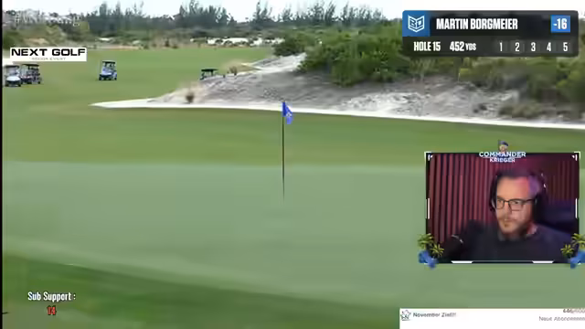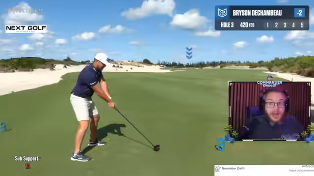 04:32:48Die ersten Schläge auf dem Golfsimulator sind laut, da der Ball mit viel Druck zwischen Bildschirm und Wand auftrifft, aber das System funktioniert. Es wird festgestellt, dass das Spiel für Gerrit hilfreich sein könnte, um mehr über die 'Reeds' zu erfahren. Ein kleiner 'Deuce' markiert den Beginn. Es wird überlegt, selbst einen Platz zu haben. Der erste Putt ist gut, ein solider Start. Die Spieler diskutieren die Strategie für den Start auf den Bahamas, wobei ein 7-Fuß-Ball direkt in die Mitte gestopft wird. Die Spieler Bryson und Martin sind bekannt für ihre Longhitter-Fähigkeiten und schlagen den Ball unfassbar weit, ihr Rekord liegt bei 420 Yards. Der Driver ist für den Streamer ein Problem, er erreicht maximal 180 Meter bei einem sehr guten Treffer und nutzt ihn selten.