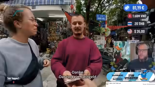 00:38:30Die Streamer starten einen 'Money Run' in Vietnam, bei dem sie ohne Geld, Handy und Fahrerlaubnis durchs Land reisen müssen. Sie erreichen Hanoi, stoßen aber auf Herausforderungen wie fehlendes Visum und unerwartete Schwierigkeiten mit anderen Teilnehmern. Die Interaktion mit der Bevölkerung ist ein zentraler Aspekt; sie bitteten Touristen um Hilfe und erhielten spontane Unterstützung in Form von Geld, Getränken und Essen. Eine Frau finanzierte sogar einen Bus für sie, was von den Streamern als 'Reisemutter' bezeichnet wurde. Diese Hilfsbereitschaft und das Erlernen von Englisch unterwegs sind prägende Elemente der Reise.