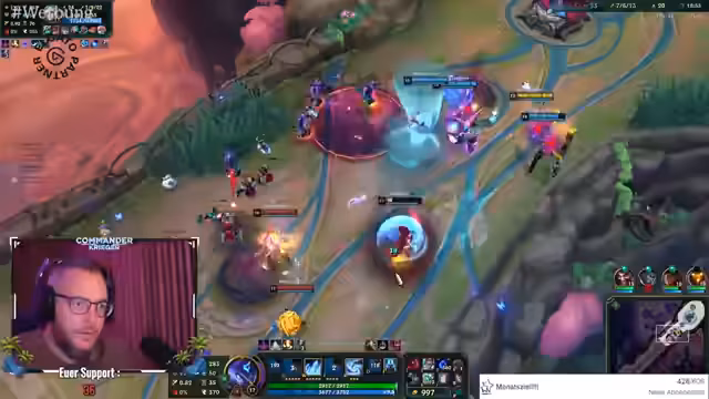 04:37:29Im Laufe des Spiels äußert sich der Streamer zunehmend frustriert über seine eigene Performance und die Teamdynamik. Er fühlt sich machtlos, da er kaum an die Gegner herankommt und keinen signifikanten Schaden anrichten kann. Er kritisiert auch die item-Wahl seines Mitspielers, der gegen ein fast voll AP-Team Rüstung kauft, und wirft dem Team vor, zu vorsichtig zu sein, was es ihnen ermöglicht, übermannt zu werden und wichtige Fights zu verlieren.