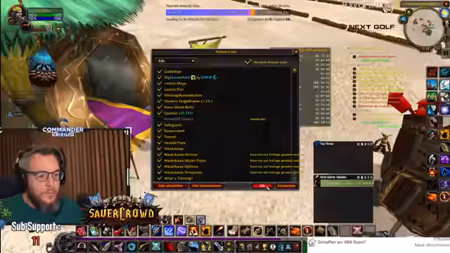06:32:35Der Streamer diskutierte die Einrichtung von Addons, um die Spiel-Erfahrung zu verbessern. Er suchte nach einer Weak Aura, die ihn warnt, wenn seine Lebenspunkte (AP) unter einen bestimmten Wert fallen, um schneller auf Gefahren reagieren zu können. Ein Zuschauer empfahl das Addon 'Safeguard', das Warnungen bei niedrigen Lebenspunkten oder in der Nähe gefährlicher Gegner (Deadly NPCs) ausgibt. Es wurden die Einstellmöglichkeiten erklärt, wie z.B. den Schwellenwert für die Warnung auf 50% zu setzen, um sich ausreichend Zeit zum Reagieren zu lassen.