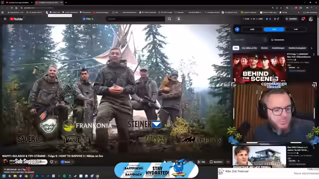 00:40:28Nach den im Studio stattfindenden Gesprächen wechselt der Stream zur Übertragung von 'Hunt to Survive', einer Überlebens-Serie im Wald. Das Team, bestehend aus Michael, Philipp, Niklas und Jericho, ist beschäftigt, Nahrungsmittel zuzubereiten und Holz zu bearbeiten. Michael kocht einen Gulasch aus Wapiti-Fleisch, während Philipp aktiv Bäume fällt. Es wird über die Verteilung der Arbeit gesprochen: Wer eine Aufgabe sieht, übernimmt sie. Die physische Anstrengung zeigt sich bei einigen Teammitgliedern bereits.
