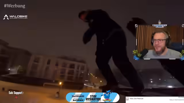 00:16:32Nachdem sein Begleiter erfolgreich gesprungen ist, wagt auch der Streamer den Sprung. Er ist dabei aufgrund seiner Fußverletzung äußerst verunsichert und bittet mehrmals um Bestätigung, bevor er sich in Bewegung setzt. Der Versuch endet damit, dass der Schneemann unter seinem Gewicht zusammenbricht, woraufhin die Aktion abgebrochen wird und die Situation als 'geisteskranke' und 'unglaubliche' Herausforderung beschrieben wird.