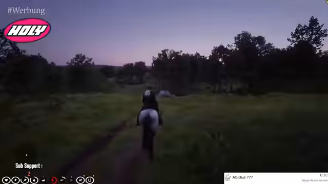 02:34:20Nach dem Waffenkauf wird es Zeit, die Kühe aus dem Stall zu holen und auf die Weide zu treiben. Der Streamer erklärt die Prozedur: man muss darauf achten, die Tiere immer zusammen zu halten und sie nur über das obere Tor aus dem Stall zu lassen. Während des Hütens taucht ein Wolf auf, und der Hund Lucky greift ihn an. Der Streamer erklärt, dass er und Moses, nicht die Kühe, angreifen sollen und gibt die Waffe an Moses. Es stellt sich heraus, dass der Hund die Kuh selbstständig zurück zum Stall führt.