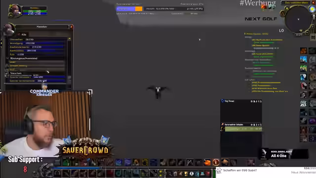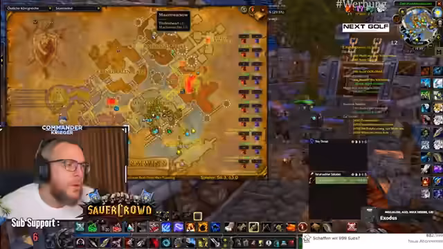 01:08:07Es gibt einen Wechsel der Aktivitäten. Anstatt weiter im Ödland zu leveln, schlägt der Streamer eine Gruppenaktivität vor. Er erwähnt, dass viele Max-Level-Spieler Dungeons wie 'Schacht im Schicht' oder 'Sulfuras' machen. Der Streamer selbst plant, leveln zu beenden und stattdessen in einem Dungeon zu helfen. Er wirft den Chat an und fragt, ob jemand Interesse hat, ihn in einem Dungeon zu begleiten.