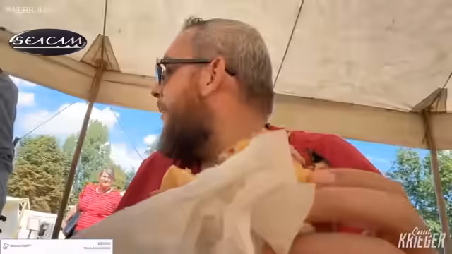 02:02:47Nach den Kämpfen unternimmt der Streamer eine kulinarische Erkundung des Marktes und probiert Spezialitäten wie „Sau im Brot“ und Granatapfeltee. Er unterhält sich mit einem Wikinger-Koch und wirbt für die Band „Kumpanei Seinerzeit“. Die Unterstützung des Vereins durch das Publikum wird betont, da die Einnahmen direkt in die Reparatur und Pflege der Ausrüstung fließen.