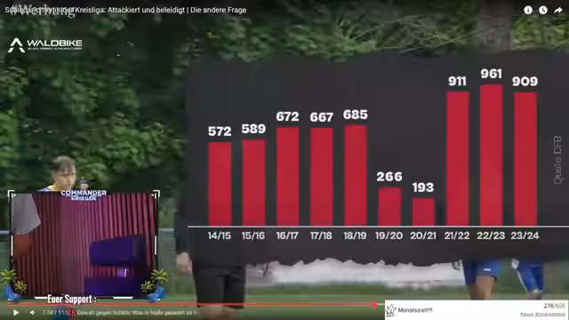 04:04:51Es wird ein Bericht über einen 17-jährigen Schiedsrichter namens Noah gezeigt, der mit einer Bodycam ausgestattet wird, um die eskalierende Gewalt und den Hass gegen Schiedsrichter auf dem Fußballplatz zu dokumentieren. Noah beschreibt, wie er in den ersten Minuten eines Spiels versucht, die Kontrolle zu übernehmen und eine Linie festzulegen. Es wird hervorgehoben, dass Schiedsrichter sein ein Ehrenamt ist, das oft mit geringer Entschädigung verbunden ist. Der Bericht zeigt, wie Eltern und Zuschauer aggressiv auf Entscheidungen des Schiedsrichters reagieren, was zu Beleidigungen und sogar tätlichen Angriffen führen kann. Ein Vorfall wird geschildert, bei dem ein Vater auf das Spielfeld rannte, um seinen Sohn zu schützen. Es wird betont, dass junge Schiedsrichter oft mit unqualifizierten und beleidigenden Kommentaren konfrontiert werden. Ein weiteres Problem ist, dass viele F-Jugendspiele ohne Schiedsrichter stattfinden müssen, da es an Nachwuchs mangelt. Trotz der Herausforderungen und des Risikos brennt Noah für seine Rolle als Schiedsrichter und träumt davon, in höheren Ligen zu pfeifen. Es wird ein Patenprogramm für junge Schiedsrichter vorgestellt, um ihnen Unterstützung zu bieten und sie vor Übergriffen zu schützen. Ein konkreter Fall wird geschildert, bei dem ein Schiedsrichter von einem Spieler mit einer Kopfnuss niedergestreckt wurde.