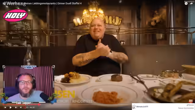 01:15:33Eine neue Staffel von Dinner Duell in der Restaurant Edition wird angekündigt. Drei Restaurants in Frankfurt treten gegeneinander an, wobei Max, Freddy, Rob und der Streamer jeweils ein Restaurant ins Rennen schicken. Jeder muss zusammen mit dem gewählten Restaurant ein Gericht mit einem persönlichen Twist versehen. Die Bewertung wird anders sein, da die anderen das Menü essen und erst am Ende erfahren, welches Gericht das Signature-Dish war, um eine doppelte Bewertung zu ermöglichen. Der Streamer besucht das Restaurant Manami Maxi, eines seiner Lieblingsrestaurants der Mo-Gruppe, um eine Auswahl für das Rennen zu treffen. Er überlegt, ob er das Restaurant ins Rennen schicken soll, obwohl es für seine Raw Bar und Meeresfrüchte bekannt ist, was Sturmwaffel möglicherweise nicht gefällt. Er spricht mit Erik über die Menüauswahl und berücksichtigt Sturmis Vorlieben. Das Mon Amie Maxi bietet französische Bistro-Küche mit Optionen wie Rinderfilet, Schnecken und Bone Marrow.