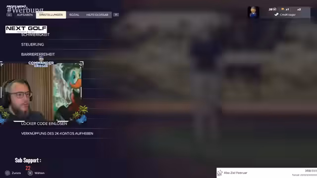 02:27:47Der Streamer kämpft mit den Einstellungen im Spiel und wechselt die Schwierigkeit von 'Profi' auf 'Meister', um die Leistung zu verbessern. Er ist frustriert über seine hohen Schlagzahlen, die weit über dem Cut-Liegen. Er analysiert seine Schwierigkeiten, insbesondere den Bunkerschlag und den Putt, und ist unsicher, ob es gelingt, den Cut zu erreichen.