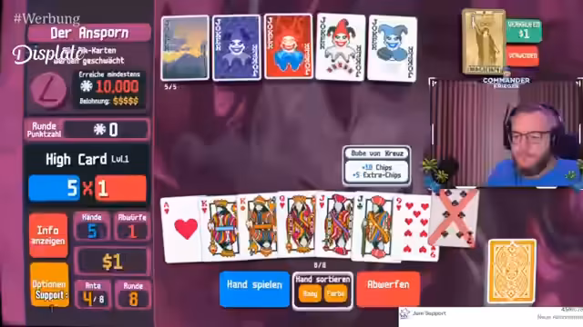 00:10:07Der Streamer konzentriert sich darauf, Karten zu kombinieren, um Multiplikatoren zu erhalten. Er analysiert seine Hände und entscheidet sich, z.B. eine Herzflasche zu spielen, um Bonuspunkte zu sammeln. Er diskutiert die Wirksamkeit verschiedener Joker-Karten und strategische Entscheidungen, wie das Wegwerfen bestimmter Karten, um für bessere Kombinationen zu platzieren. Er betont, dass Verstärker und Upgrades essenziell für den Erfolg sind und man wissen muss, welche Karten man behalten und welche man abwerfen soll.