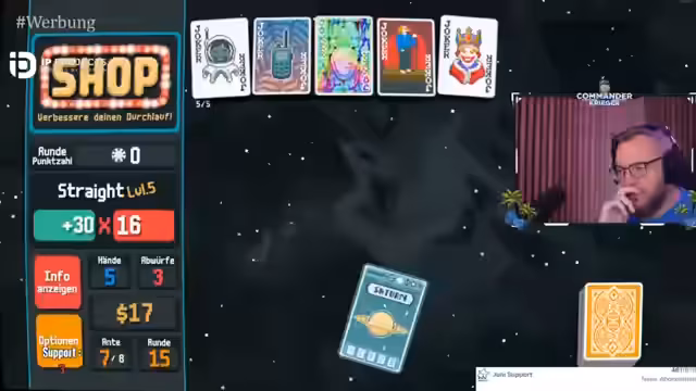 00:00:45Der Stream beginnt mit der Begrüßung von Chatmitgliedern wie Quincy und Yoshi. Der Streamer startet das Kartenspiel 'Bellatro', das er als süchtig machend beschreibt. Er spielt Runden, in denen er verschiedene Pokerhände wie Drilling, Flush und Full House anstrebt, und kommentiert seine Züge sowie die erhaltenen Karten. Er erwähnt, dass das Spiel ihn süchtig gemacht hat und er es gestern zum ersten Mal ausprobiert hat, und beginnt in eine entspannte Art mit dem Kartengedresche.
