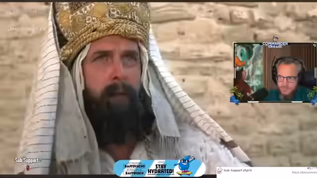 03:24:56Aufgrund eines Chat-Eintrags, der spezielle Filme wünscht, erinnert sich der Streamer an „Die Heilige Kokosnuss“. Er empfiehlt diesen Klamauk-Film als eine absolute Empfehlung für alle, die Blödel-Humor mögen. Er lobt den Humor des Films als originell und humorvoll. Anschließend zitiert er die berühmte Steinigungsszene mit dem Ausspruch: ‚Nichts, das steht geschrieben!‘, um die skurrile Komik des Films zu unterstreichen.