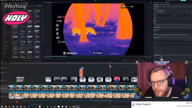 04:49:03Der Streamer stellt ein neues Wärmebildgerät vor, das er unboxt und getestet hat. Er beschreibt die technischen Spezifikationen wie die verschiedenen Farbpaletten, den Bild-im-Bild-Modus und die IP67-Zertifizierung für Wasserschutz. Er zeigt erste Aufnahmen von einem Waldspaziergang, bei denen er verschiedene Tiere wie Mäuse und einen Hasen im Thermalbild beobachten konnte. Er betont, dass er das Gerät nicht zum Jagen, sondern für die Wildtierfotografie nutzt, um Tiere zu beobachten, ohne sie zu stören.