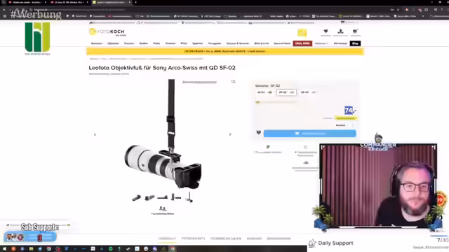 07:41:20Ein zentraler Kritikpunkt des Streamers ist der Stativfuß des neuen Telezoom-Objektivs von Sony. Dieser ist als extrem unpraktisch beschrieben, da er nicht zu Standard-Stativplatten passt und den Einsatz erschwert. Als Lösung werden Drittanbieter wie Leo Foto genannt, die alternative, kompatible Füße anbieten. Der Streamer zeigt auch seine eigene kostengünstigere Alternative und kritisiert den exorbitanten Preis des Original-Teils. Weitere kritische Worte finden sich für eine vermeintliche Sony-spezifische Unpünktlichkeit bei Produktvorstellungen.