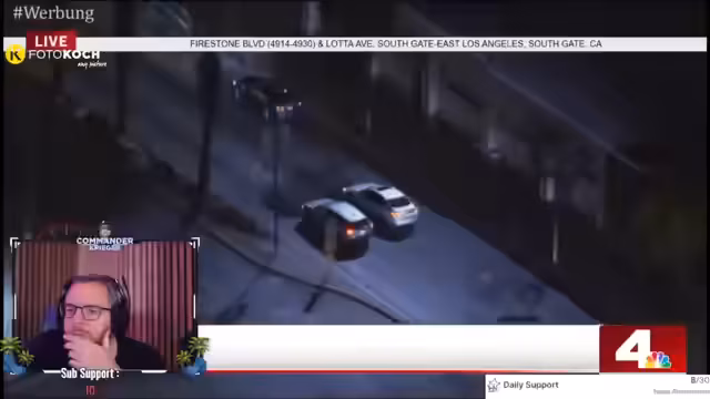 07:49:43Der Stream wechselt zu einem Live-Ereignis in den USA, bei dem eine Polizei-Verfolgungsjagd übertragen wird. Der Kommentator analysiert die fahndenden Kräfte, die mit mehreren Einsatzfahrzeugen und einem Polizeihelikopter agieren. Besonders hervorgehoben wird die beeindruckende Technologie der Helikopterkamera, die aus großer Höhe Kennzeichen und Details erkennen kann. Der Fahrer wird dabei als stupide und langsam beschrieben, während die Polizei sich auf eine Auslaufsituation einzustellen scheint, anstatt sofort aggressiv einzuschreiten.