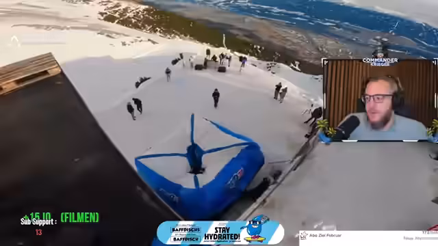 00:01:09Der Stream startet mit der Ankunft auf einem Event in Innsbruck. Ursprünglich als Schneehaufen-Jam geplant, wurde aufgrund des schneearmen Wetters ein Airbag als Landeplatz auf 2000 Meter Höhe aufgebaut. Der Streamer begrüßt die versammelten Creator und Athleten und stellt das Konzept vor, bei dem die Teilnehmer in den Airbag springen werden. Die Kulisse in den Alpen wird als weltklasse beschrieben, und der erste Absprung wird bereits unmittelbar nach der Ankunft vorbereitet.