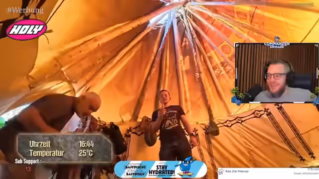 01:07:26Die Szenarien von Event und Camp werden vermengt. Der Streamer berichtet von der anstrengenden Arbeit des Holzfällens und Schälens, die ihm Rückenschmerzen bereitet und als extrem mühsam beschrieben wird. Trotzdem besteht großer Optimismus, da der Bau des Tipis voranschreitet. Die Durchhaltefähigkeit wird auf das gemeinsame Ziel und den baldigen Erfolg zurückgeführt. Der Alltag wird durch die täglichen Routinen des Kochens und der Vorbereitung geprägt.