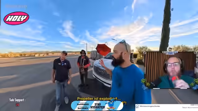 03:18:20Während des Flugs in der Mojave-Wüste explodiert Propeller und Tank des Motors von Dave, was zu einer Notlandung führt. Der Streamer analysiert den Unfall: Vibrationen lockerten den Tank, der dann vom Propeller zerfetzt wurde. Er rät von risikoreichen Starts ab und betont, dass nur Glück eine Katastrophe verhinderte. Trotz des Ausfalls der Motoren wird die Ruhe bewahrt, und eine sichere Landung ohne Motor wird durchgeführt.