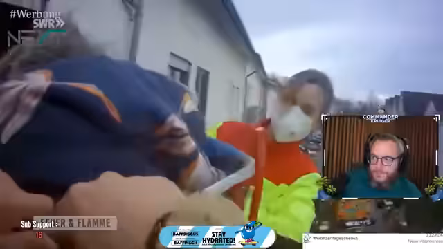 00:00:02Der Einsatz beginnt mit einer Tragehilfe im Stadtteil Emmertsgrund, wo die Feuerwehr aufgrund beengter Verhältnisse in einem Gebäude mit sehr steilen und engen Treppen konfrontiert ist. Der Patient, ein COPD-Kranker, kann nicht mit dem Tragestuhl die Treppe heruntergebracht werden, weshalb eine Rettung über die Drehleiter erwogen wird. Die Herausforderung besteht darin, dass der Patient nicht flach liegen kann, um das Atmen zu erleichtern, und die Treppenstufen mit Malervlies überzogen sind, was eine Rutschgefahr birgt. Die Feuerwehr plant daher, den Patienten liegend über die Drehleiter zu transportieren, da eine Teilung der Trage nicht möglich ist.