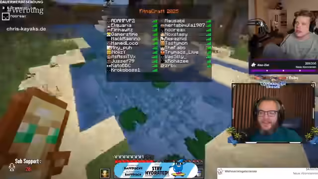 01:40:22Nach einem Raid bedankt sich der Streamer bei der Community und wechselt zu Minecraft-Inhalten. Er spricht über ein "Fitna"-Spiel, bei dem er Fragen stellt, welche Personen er ohne Konsequenzen in die Lava schubsen würde. Nennt Namen wie Noisy, Schradin und andere. Die Community beteiligt sich aktiv, und der Streamer interagiert entspannt, während er persönliche Anekdoten teilt und den Stream ausklingen lässt.