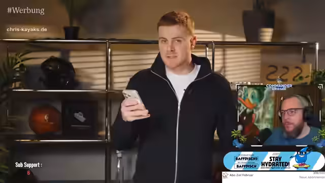 00:01:00Zuerst wird der Cannabis-Lieferdienst GetKong getestet. Die Bestellung ist einfach und dauert nur wenige Minuten, ohne dass eine Alters- oder Identitätsprüfung stattfindet. Gleichzeitig wird ein persönliches Thema angesprochen: der Streamer leidet unter Tennisarm (Epikondylitis) und zeigt eine Manschette, die ihm Linderung verschaffen soll. Er erläutert die Funktionsweise, die das Abfangen der Zugkräfte auf die Sehnenansätze ermöglicht, und erwähnt, dass er selbst eine solche Unterstützung benötigt, um den Arm zu schonen.
