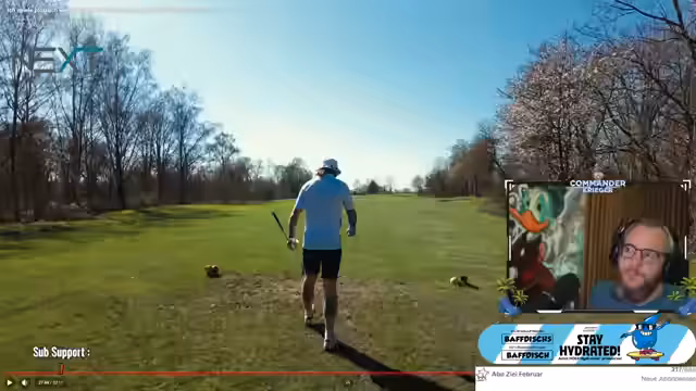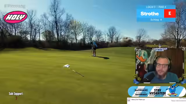 01:27:14Nach einem traumhaften, kamerabewegten Drive auf das erste Loch, der vom Streamer als einer der schönsten Bälle seiner Karriere bezeichnet wird, folgt eine strategische Planung für den zweiten Schlag. Die Entscheidung fällt für einen einfachen Bump and Run, um die nassen Bedingungen zu umgehen. Nach zwei perfekten Schlägen wird der Ball versenkt. Nach drei Löchern steht der Streamer bei Even Par, eine Position, die er als absolut geil und als eine der besten Runden auf Kamera betrachtet.