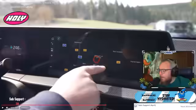 04:21:10Die Bewertung des Systems ist gemischt. Einerseits lobt der Streamer die klare und ruhige Darstellung im Home-Display und die vom Fahrer anpassbare Reichweite in verschiedenen Bedingungen. Andererseits kritisiert er massiv, dass das angezeigte Fahrzeug nicht der tatsächlich gefahrene Kia EV6 ist, was er als katastrophal empfindet. Zusätzlich beklagt er eine langsame Reaktionszeit des Bildschirms und ein ruckelndes Verhalten bei Bedienung sowie das während der Fahrt sichtbare Wackeln des Displays.