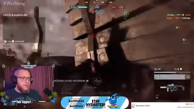 00:40:09Die Spieler erleben weiterhin Schwierigkeiten mit der 50-Meter-Kill-Herausforderung und äußern ihren Frust über die geringe Anzahl an erzielten Kills. Ein Spieler berichtet von wiederkehrenden Abstürzen seiner Playstation beim Spielen von Battlefield, was zu einer Entscheidung führt, zukünftig mehr auf dem PC zu spielen. Er erwähnt, dass dies sein erster Shooter auf dem PC ist und er den Controller vermisst. Die technischen Probleme mit der Playstation, insbesondere bei der Einbindung in den Stream über HDMI-Splitter und Headset, haben ihn dazu bewogen, auf den PC umzusteigen, um weitere 'Rumwerkeln' und 'Lösungssuchen' zu vermeiden. Dies verdeutlicht die Herausforderungen, denen sich Streamer bei der technischen Einrichtung gegenübersehen.