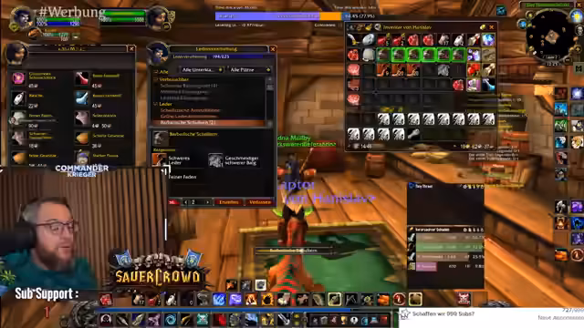10:48:19Der Fokus verschiebt sich auf die Verbesserung der Berufe. Der Streamer muss das 'Kochbuch' leveln, um weiter im Beruf 'Kochen' aufsteigen zu können. Es werden Pläne gemacht, um in 'Sturmwind' zu reisen, um dort erweiterte Rezepte zu kaufen. Gleichzeitig finden Interaktionen mit der Community statt. Der Streamer bietet an, bei der Verzauberung zu helfen, und tauscht Materialien wie Lein und Stoff mit anderen Spielern aus. Es werden auch die Bereiche 'Verzauberkunst' und 'Angeln' als zu entwickelnde Berufe erwähnt.