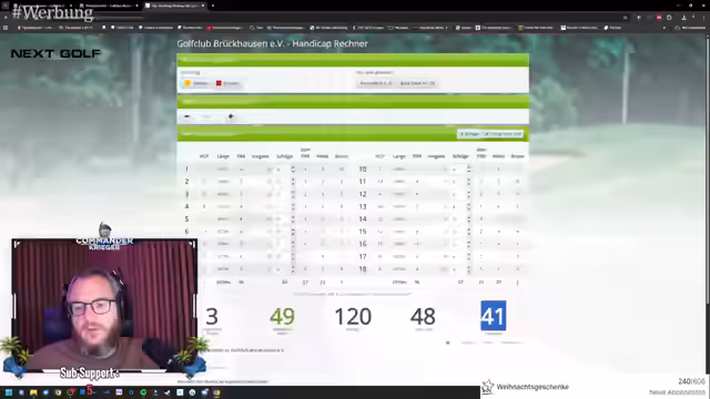 00:10:04Der Streamer beschreibt seine Erlebnisse auf den Golfplätzen, insbesondere seine Fehlschläge und eine Lady, bei der er den Ball vom Herrenabschlag nicht über den Damenabschlag schaffen musste und eine Runde ausgeben musste. Er erzählt auch von einem besonders schlechten Loch mit neun Schlägen, das ihm alle Nettopunkte kostete. Dabei betont er seine Freude über die Platzreife, die er erst vor drei Monaten erhalten hat.