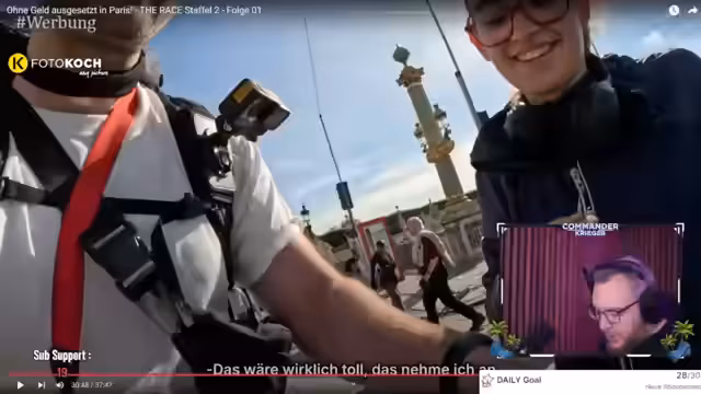 02:44:55Mit neuem Energiegeladen startet der Streamer in die Lösung des dritten Rätsels, das ihn zum Arc de Triomphe du Carousel führt. Hier muss er die Anzahl der Pferde auf einem Karussell ermitteln, was sich als einfacher herausstellt als erwartet. Nach kurzer Rücksprache mit Einheimischen und der Bestätigung der Antwort durch eine niederländische Touristin, steht fest: Es sind vier Pferde. Dieses kleine Erfolgserlebnis gibt ihm neuen Schwung für den weiteren Weg und motiviert ihn, das Ziel schnellstmöglich zu erreichen.